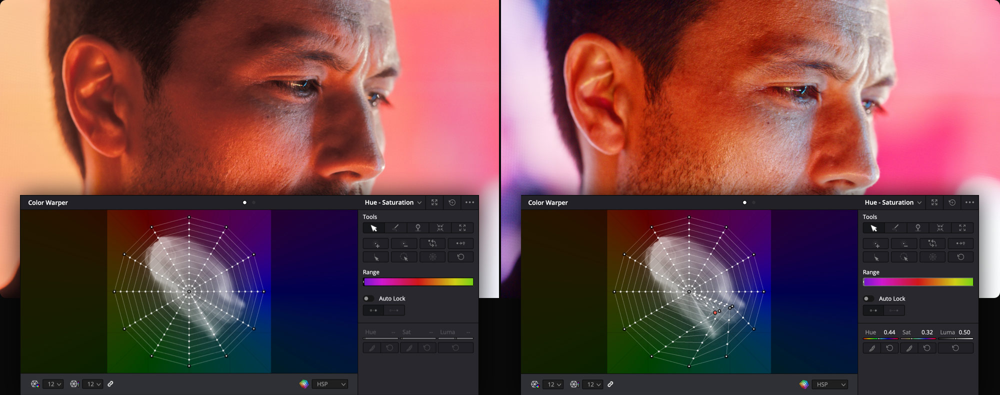 Standardkurveværktøjerne giver dig mulighed for at forme farve og kontrast på en række kreative måder. Den nye farveforvrængningsværktøj går endnu videre og giver dig mulighed for at indstille en farvetone vs. farvetone-farvegrad for specifikke mætninger. Dette giver dig mulighed for at give billeder en helt ny fornemmelse! Den giver dig også mulighed for at forvrænge farver baseret på luminans eller lysstyrke. Når du klikker på farveforvrængningspaletten, ser du en web- eller gittervisning af alle nuancer og mætninger i et billede. Du skal blot vælge en hvilken som helst nuance eller et område af nuancer enten på nettet eller direkte i billedfremviseren, og derefter trække det område til et andet nuance- og mætningspunkt på nettet i paletten. Det er en helt ny og innovativ måde at transformere farver i dine billeder på! Du kan også have samme grading tabel på hele din film, hvilket gør at man ikke kan se de forskellige optagelsers miljø…